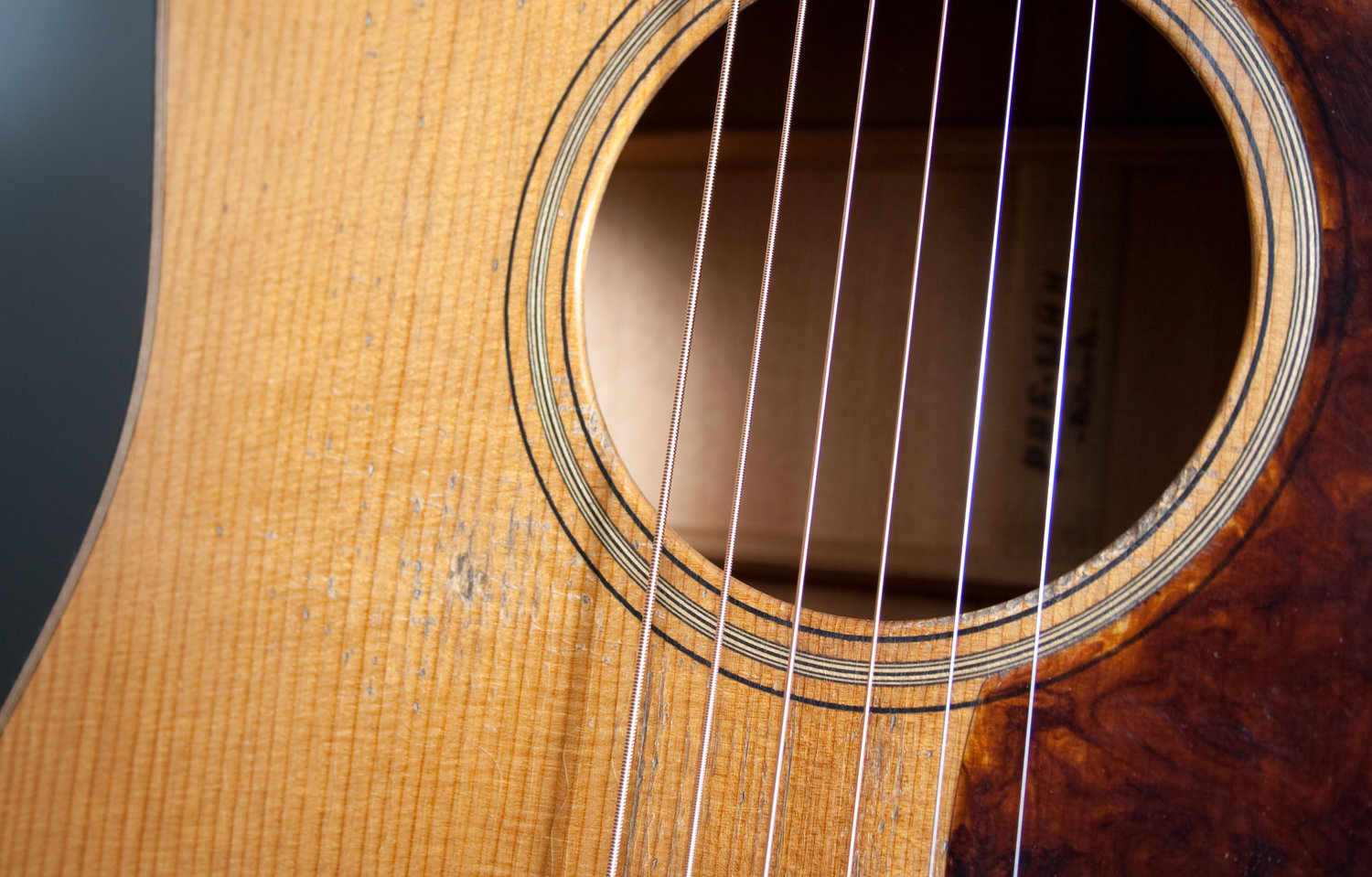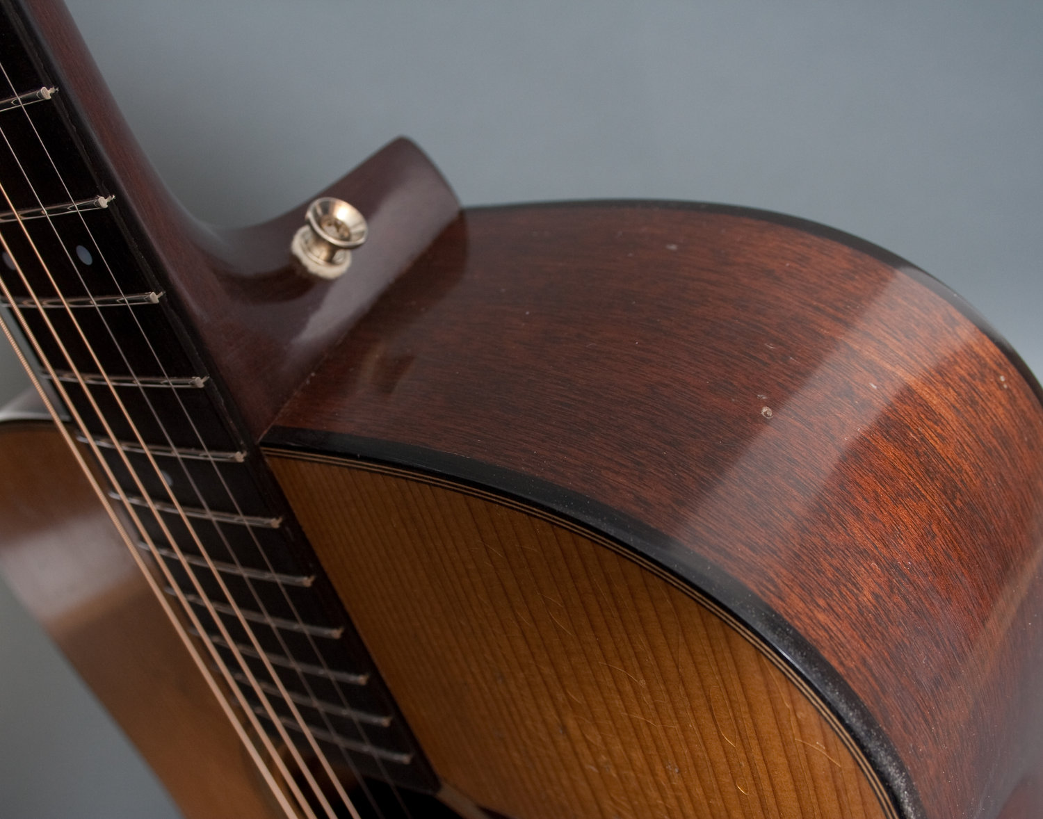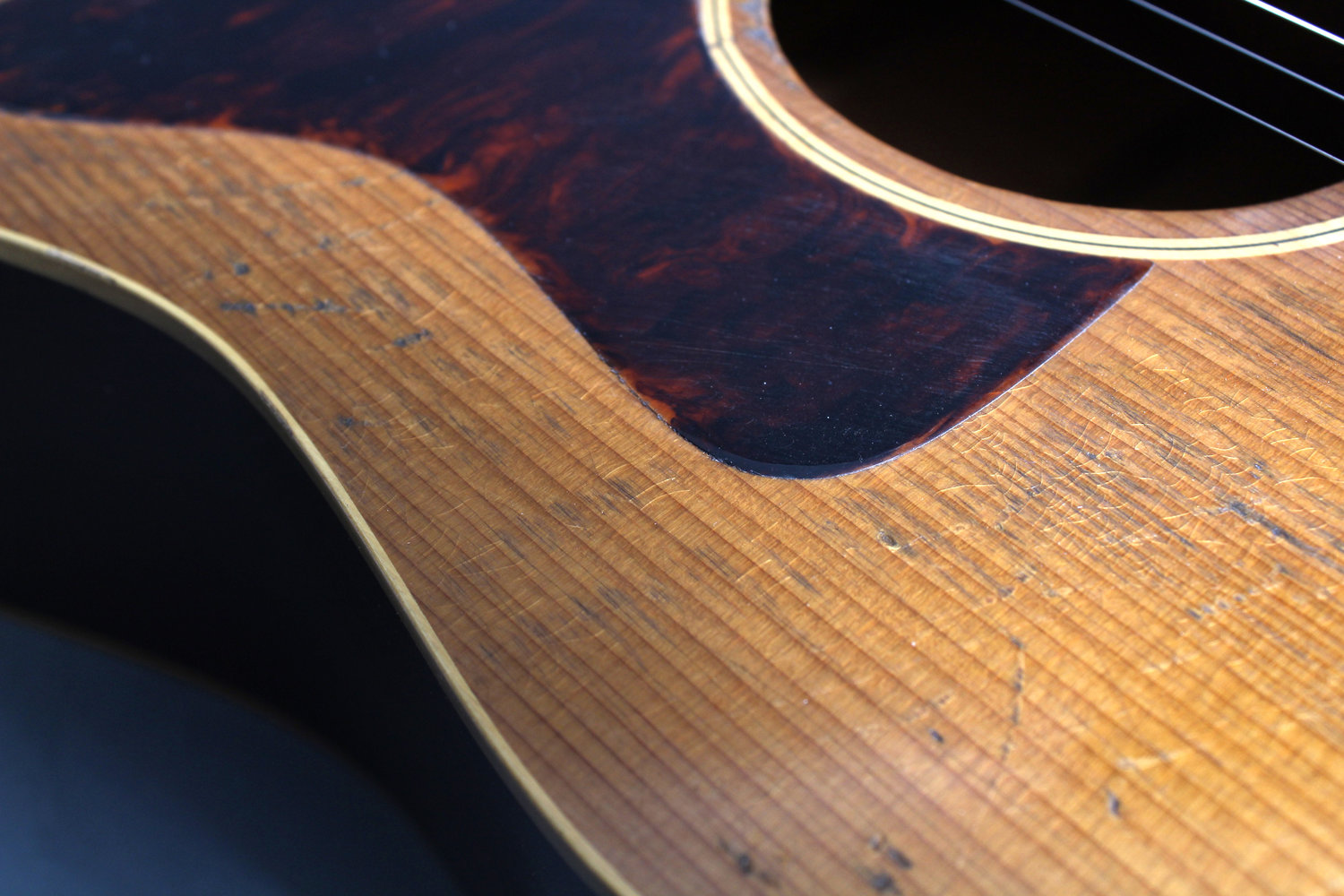 Inspired by vintage guitars that were lovingly cared for and played for much of their life. Same thin, aged, and checked lacquer as the level one, with the addition of authentically created play wear around the soundhole, some incidental handling marks, light wear at the elbow area, and light back wear. |