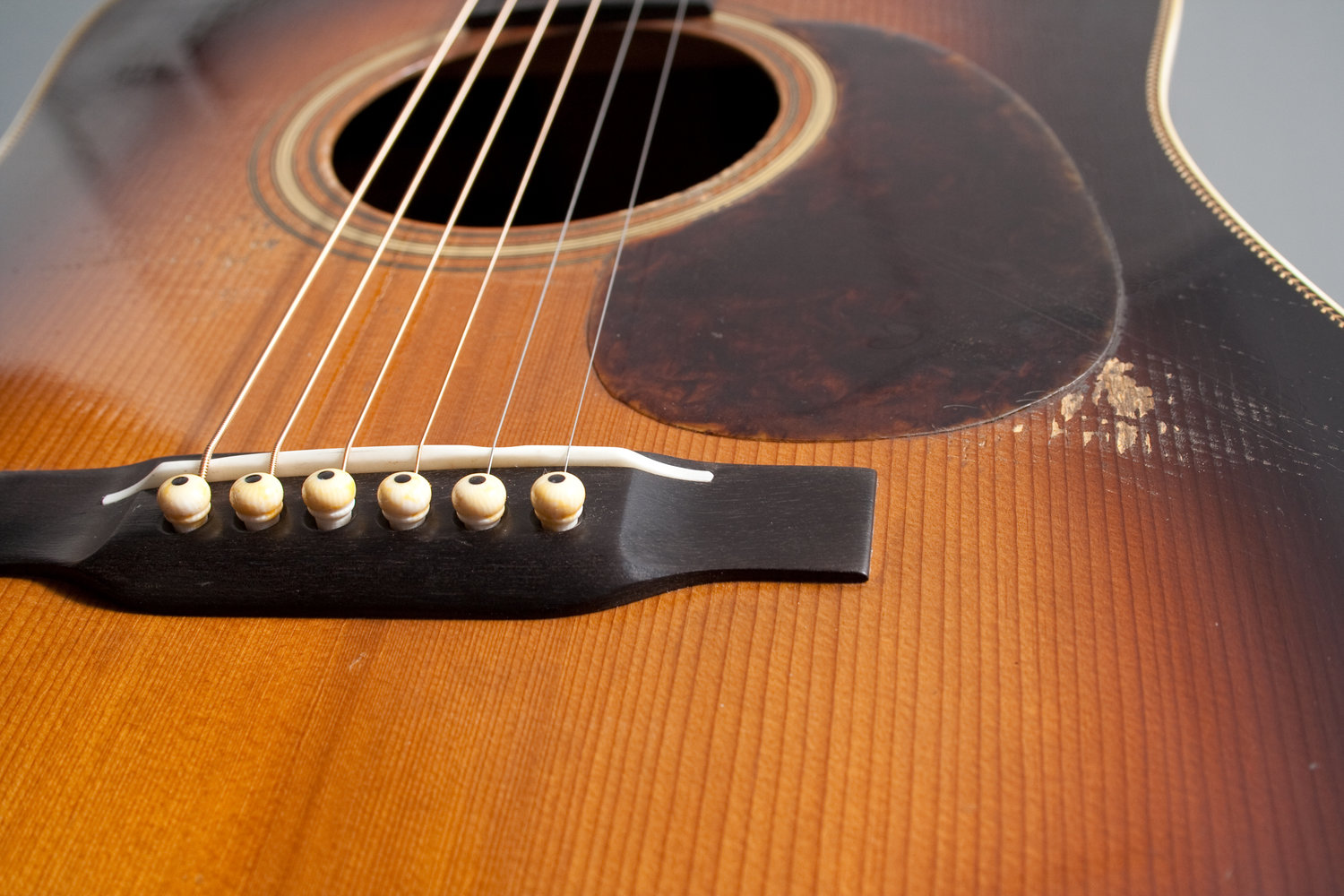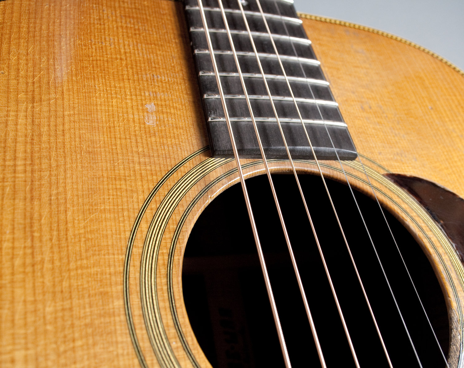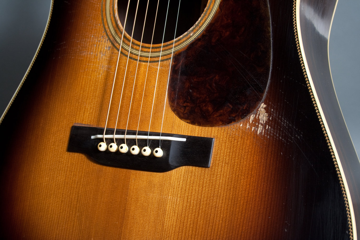 Inspired by vintage guitars that were lovingly cared for and played for much of their life. Same thin, aged, and checked lacquer as the level one, with the addition of authentically created play wear around the soundhole, some incidental handling marks, light wear at the elbow area, and light back wear. |