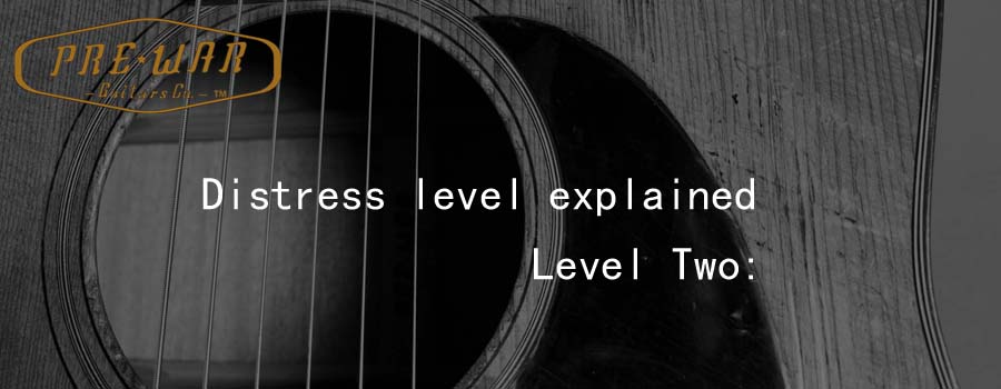 Starting at level 1 our "distress level" is a critical component to the vintage sound that we are able to achieve. Our finishes are ultra thin Nitro Cellulose. We apply this to be of minimal thickness, which is a crucial ingredient to the sound of our guitars. Our ultra thin finish has a natural vintage patina because if the way it is applied, it is also "checked" to relieve the surface tension and get a more open and dry tone. A thin "checked" finish with a natural vintage patina is the baseline finish on all Pre-War Guitars. By not applying a thick "Ferrari Glass" finish we allow our instruments to breathe freely with vintage character and tone.