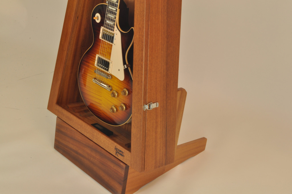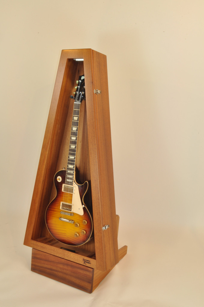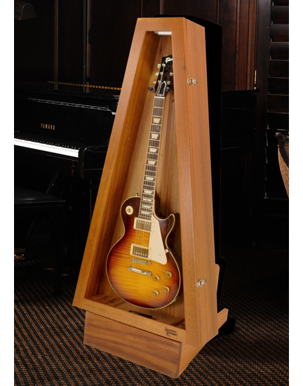 Ribbon Striped African Mahogany Floor ClimaStand for Electric Guitars リボン・アフリカン・マホガニーRibboned African Mahogany, Khaya Ivorensis この材は薄い茶からこい茶色にハニーカラーのストライプやフィギャーが複雑に入っています。アフリカン・マホガニーはアフリカ西部かで伐採されて世界中に供給されています。数多くのギター・メーカーが高級ギターの製作に使用しています。