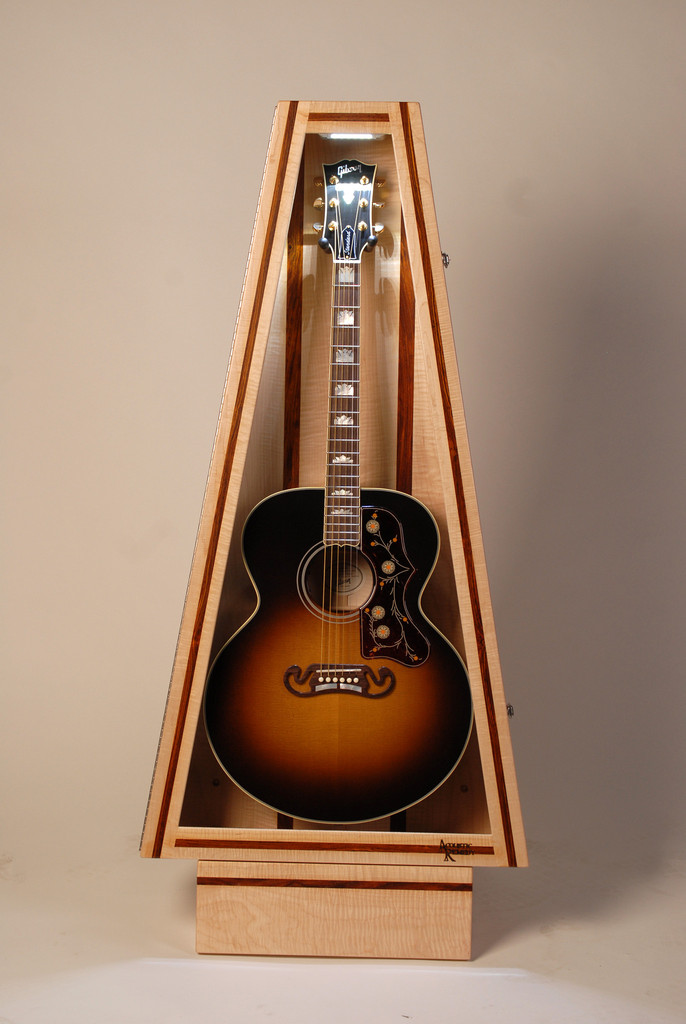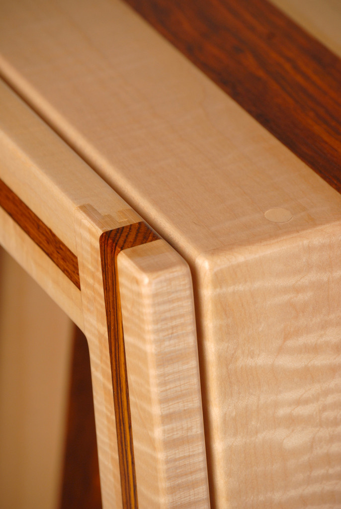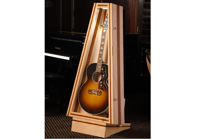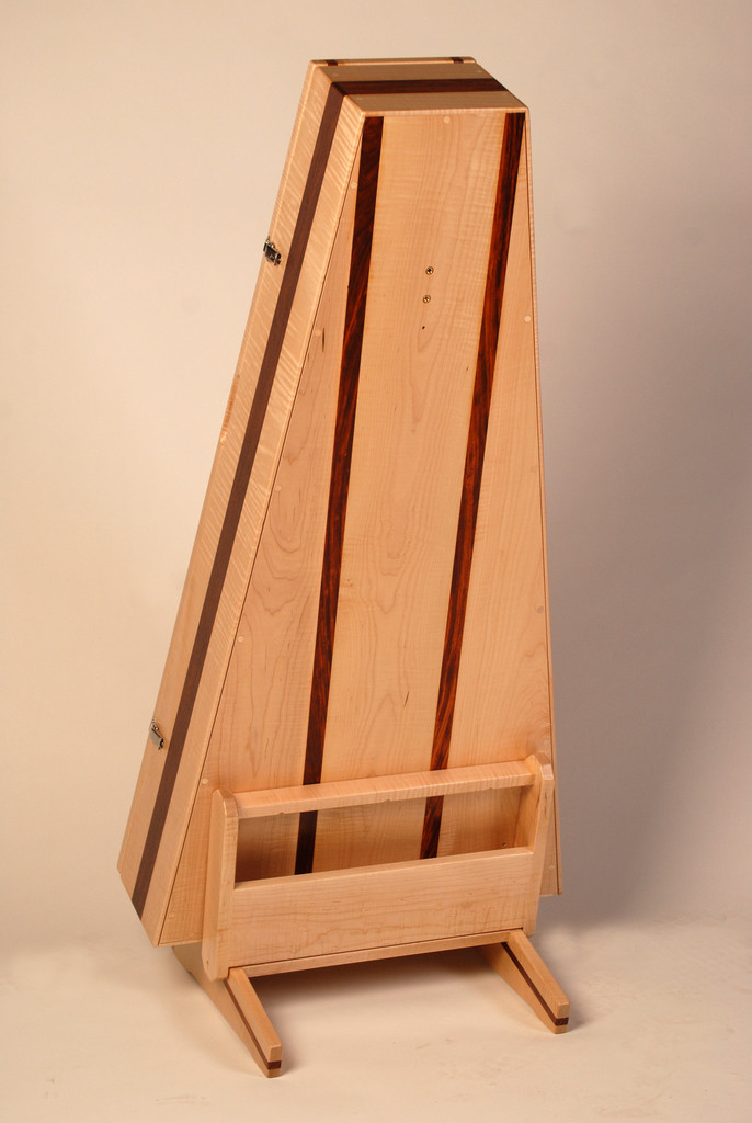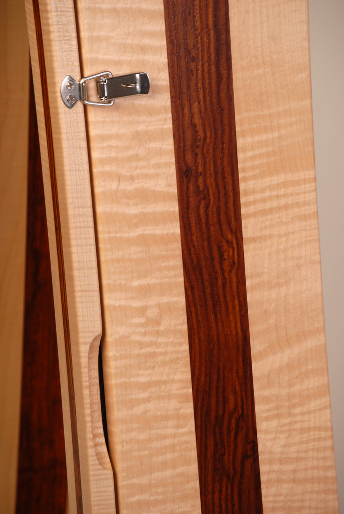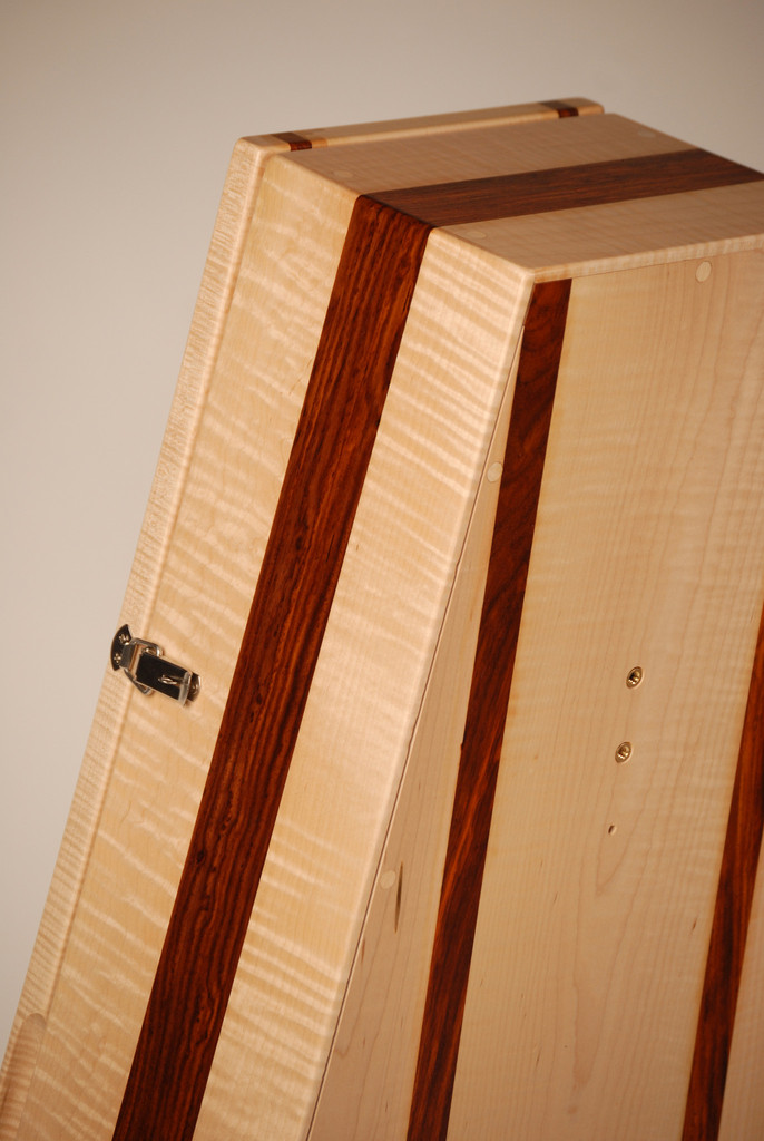 フレームメイプルとココボロの美しい材の組み合わせです。ケースの上面、側面、背面、扉にストライプが入ります。