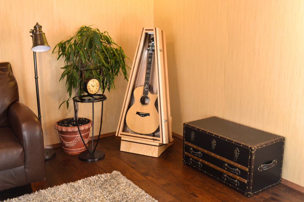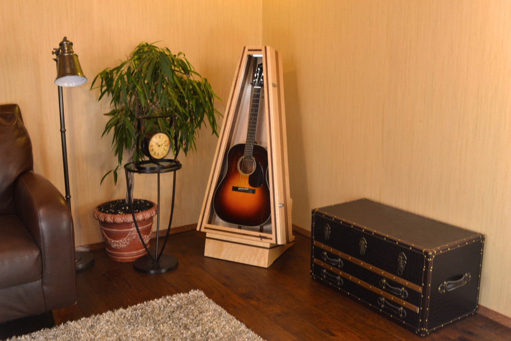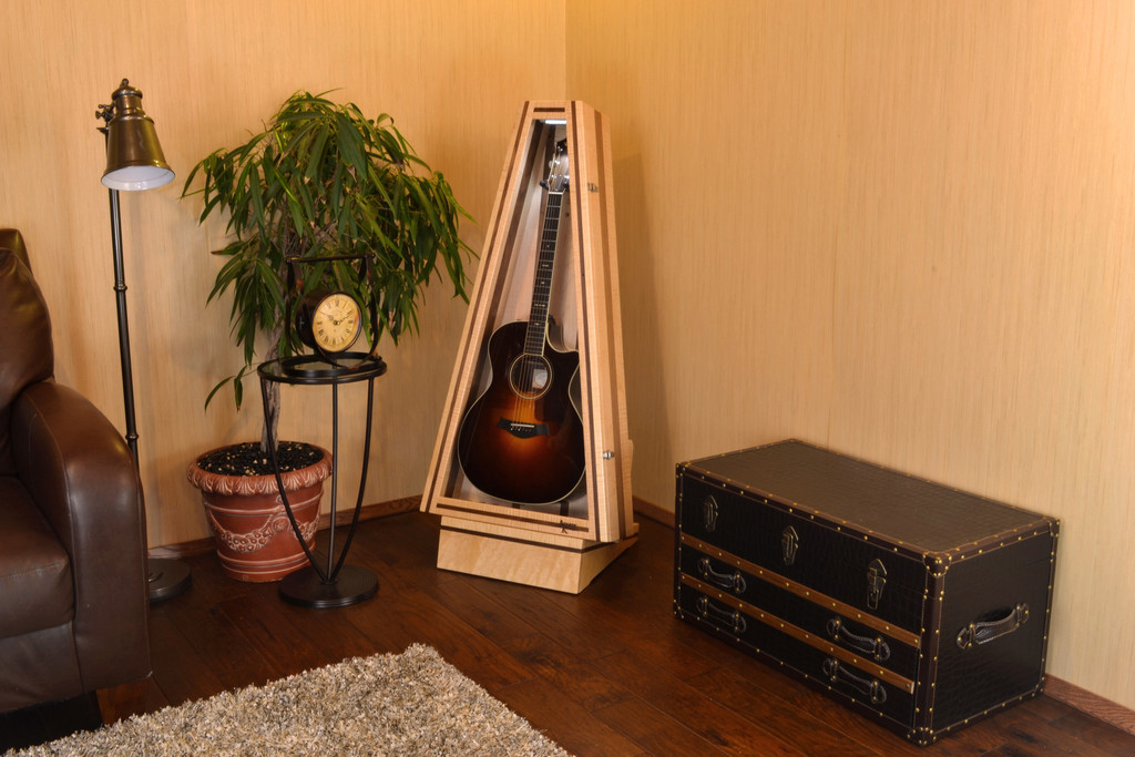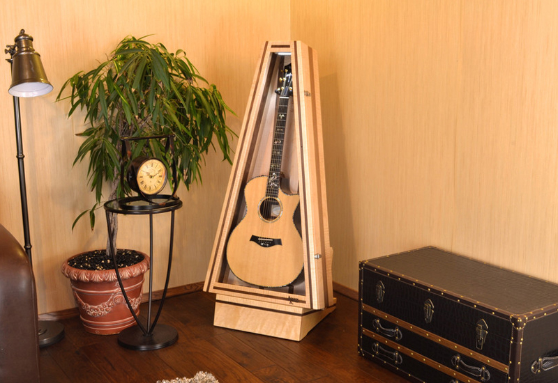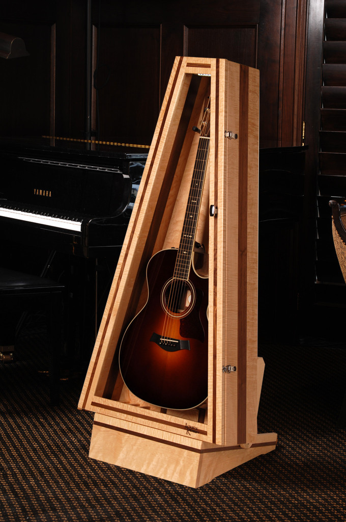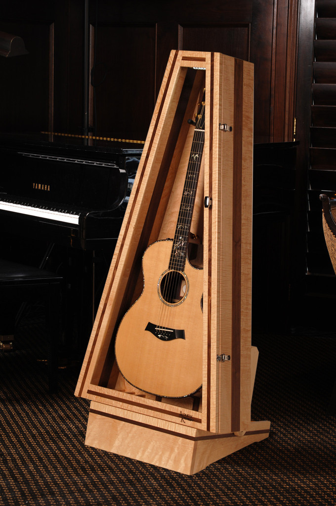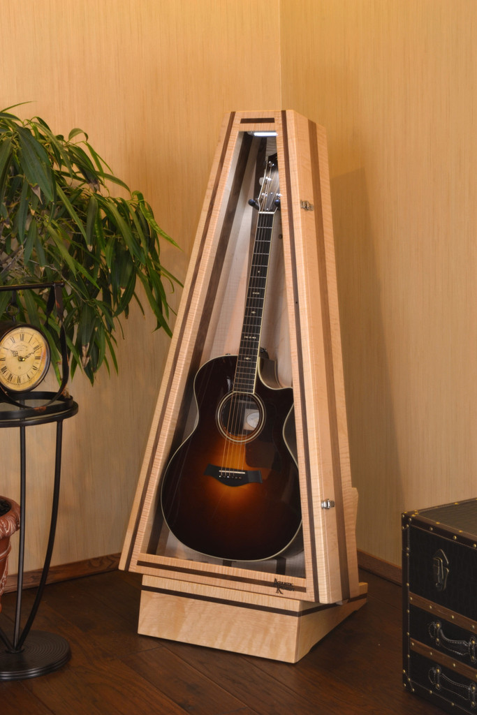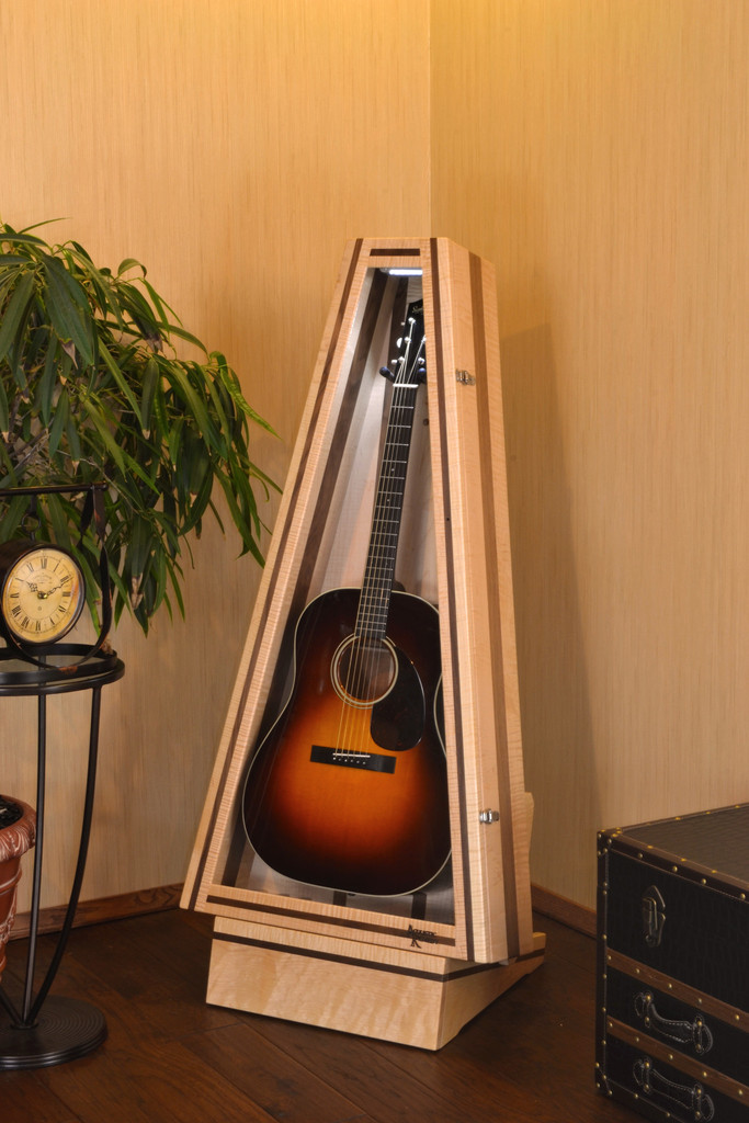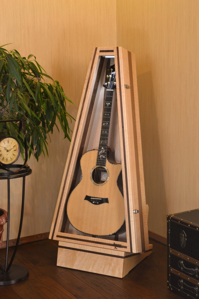 フレームメイプルとウォルナットの美しい材の組み合わせです。ケースの上面、側面、背面、扉にストライプが入ります。