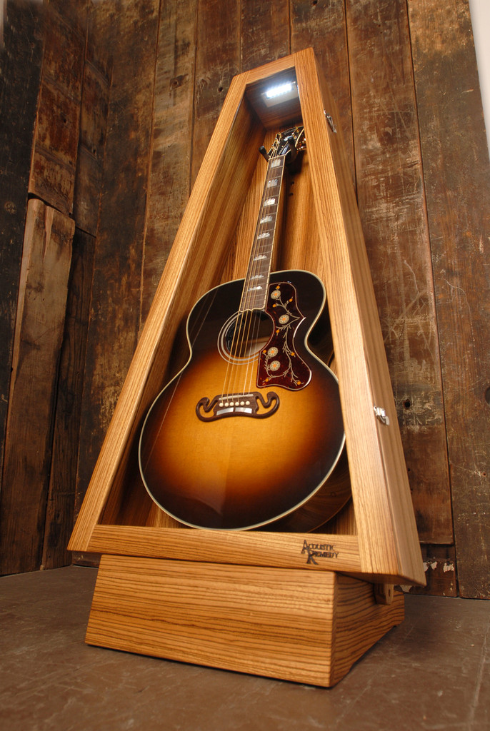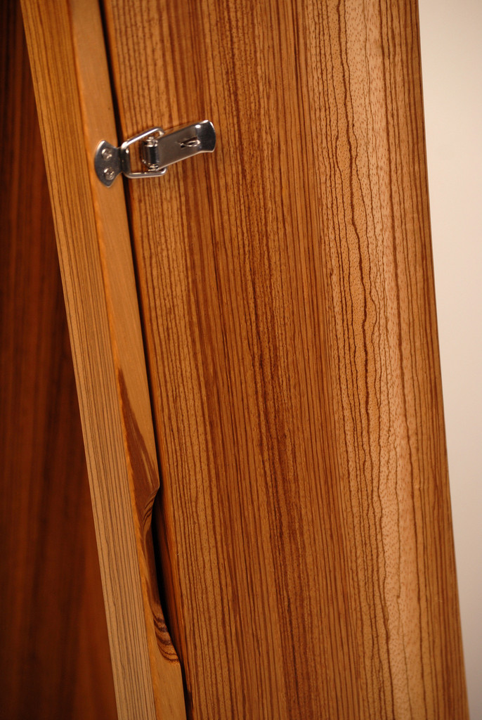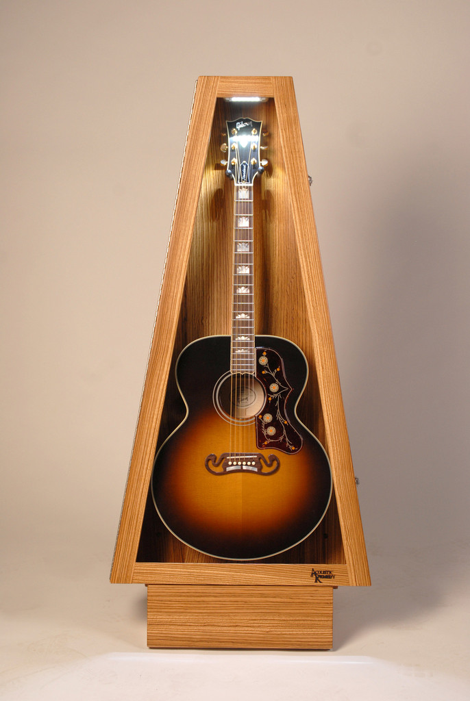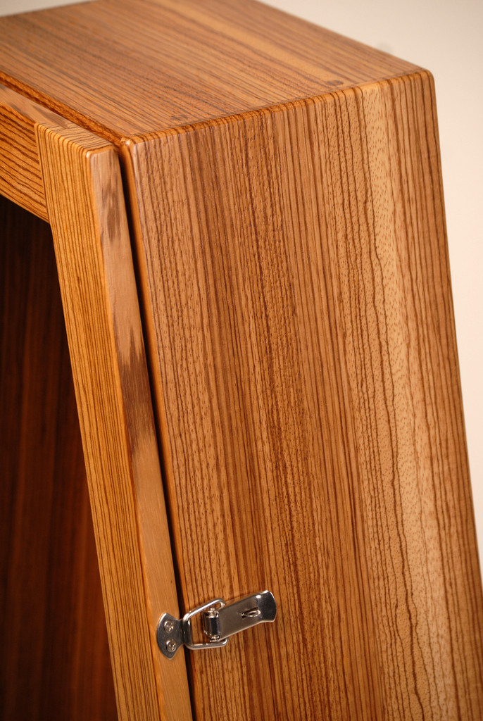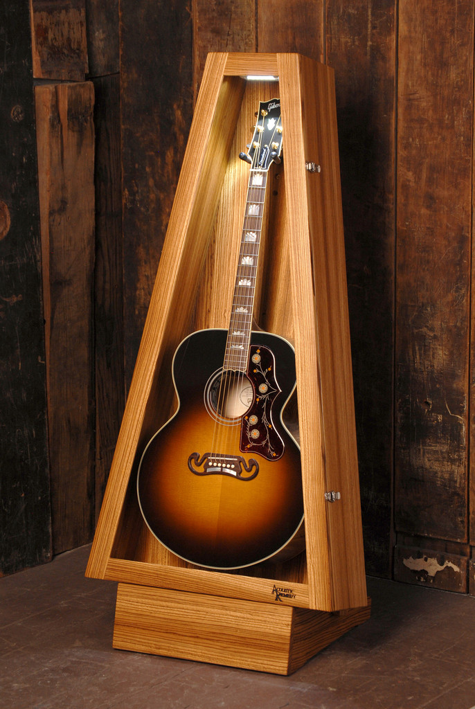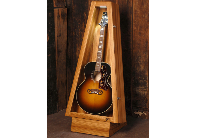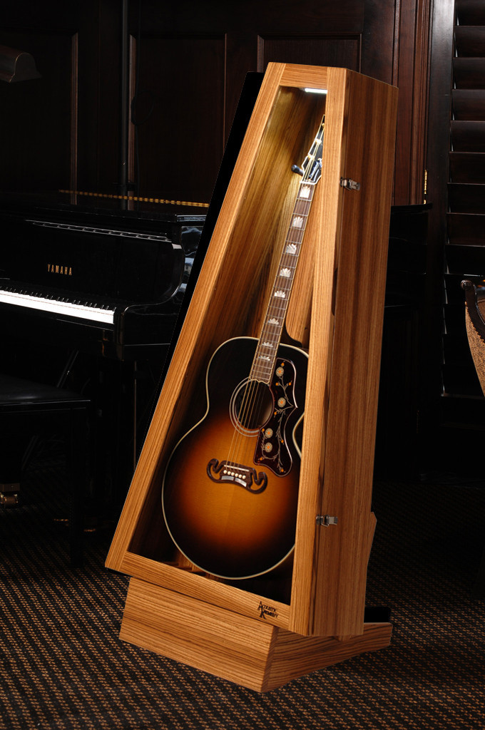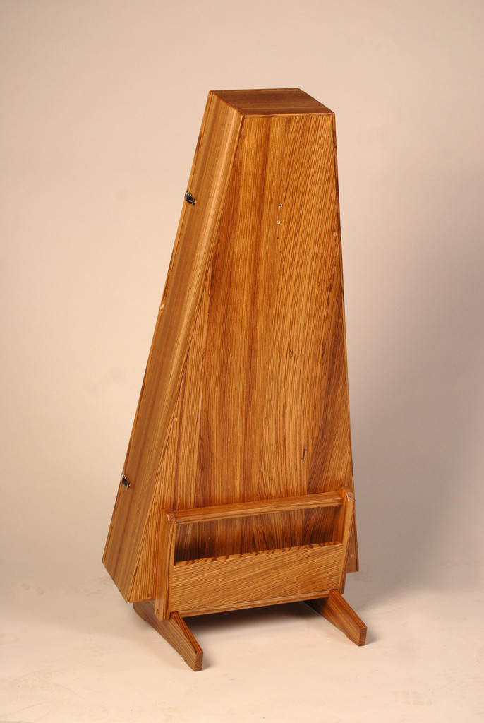 ゼブラウッド Zebrawood, Microberlinia brazzavillensis 中央アフリカの材で、薄茶からクリーム色に濃い茶や黒のシマ馬のような縞が入っています。ゼブラのとも呼ばれることのあるこの材は、堅く丈夫な木でラッカーをかけるとうっすらと美しい光沢が出ます。縦の縞がクリマ・スタンドのラインとマッチし、さらにギターのフォルムと美しいコントラストを醸し出しています。